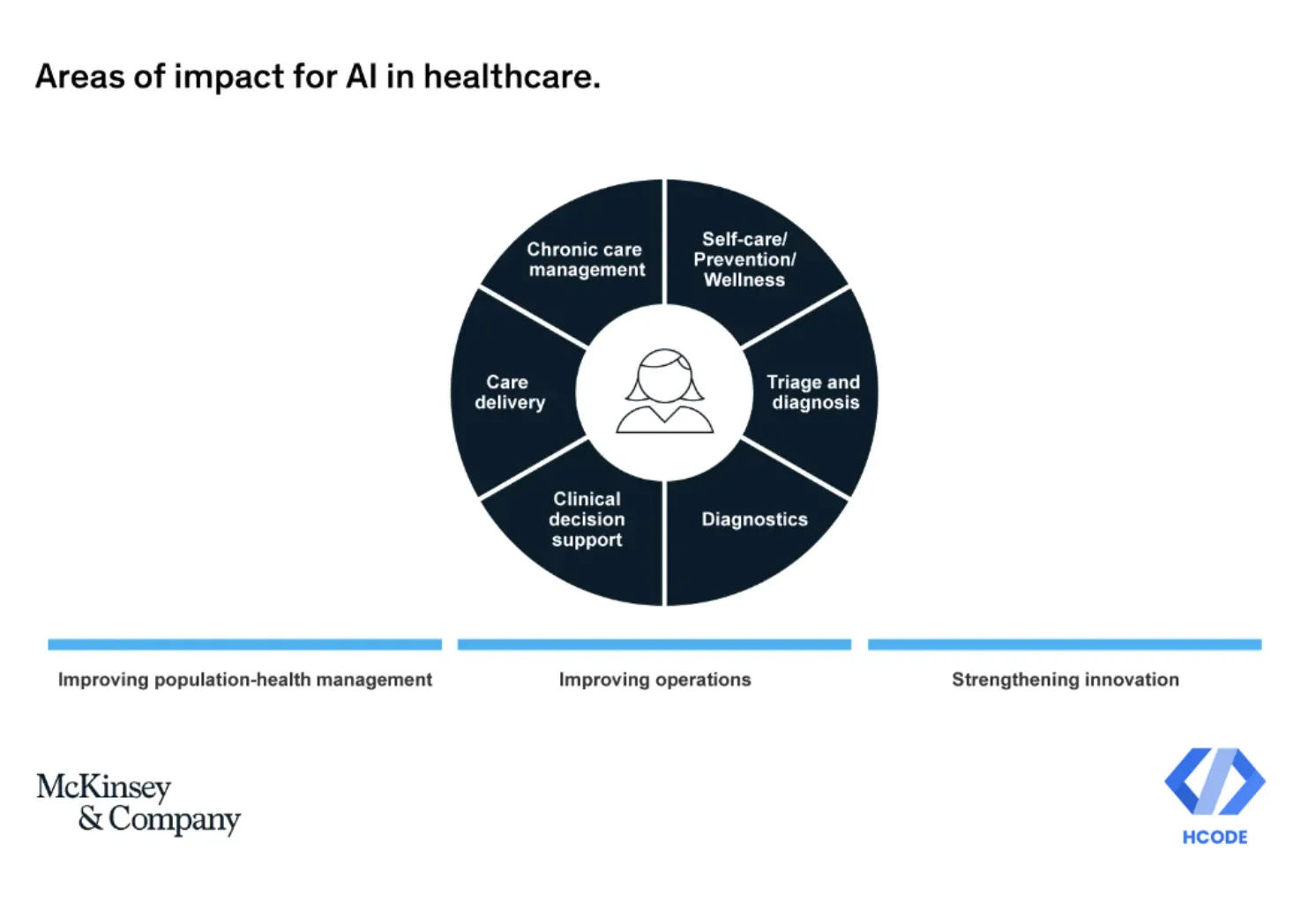AI in healthcare accelerates disease diagnoses, predicts health issues early, tailors treatment plans, and offers 24/7 support through virtual assistants. It streamlines workflows by automating tasks, managing records, and aiding drug discovery. Notably, AI is a tool, not a replacement for human healthcare professionals, underscoring the importance of ethical considerations.