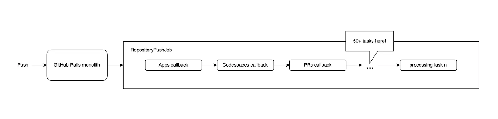 Previously, GitHub’s push request workflow involved a complex, monolithic process known as RepositoryPushJob. GitHub’s push request architecture resembled a long, sequential series of steps, as shown in the image below.